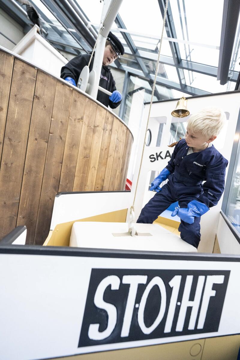 La barna utfolde seg i vår populære lekekrok på Kystmuseet - Fiskemottaket. Her er det utkledningsklær, fiskekasser og en leketavle. Passer godt for barn i alderen 2-12 år.