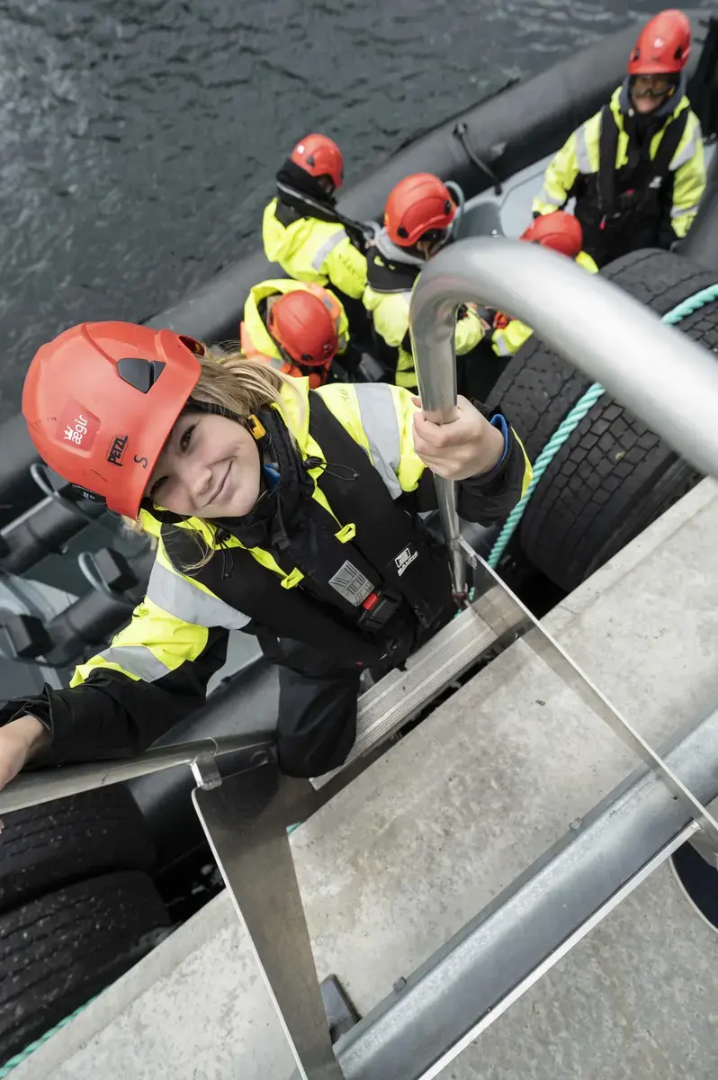 Vi stiller med både hjelm og redningsvester, men barna må selv sørge for gode sko og varme klær for å være ute på sjøen.