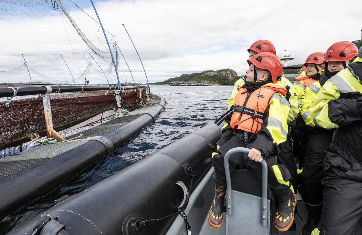 Vi stiller med både hjelm og redningsvester, men barna må selv sørge for gode sko og varme klær for å være ute på sjøen. Vi vil legge til ved merdkanten, og derfor kan støvler være å foretrekke.