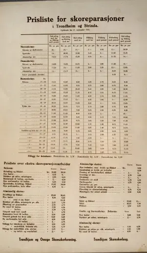 Å kjøpe sko var gjerne en investering. Skoene ble tatt vare på og reparert om de gikk i stykker. Kanskje hadde en hælflikk løsna og falt av. Da tok man turen om skomakeren og høre om det det lot seg gjør å få skoen reparert, hvor lang tid det tok og hvor mye det kostet. Dette er en prisliste for Trondheim og Strinda fra 1959.