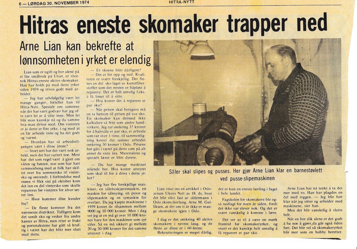 Skomaker Arne Lian trappet ned virksomheten i 1974. Da sa han i lokalavisa at det ikke lønte seg lenger. På den tida skjedde det noe som fikk stor betydning for flere yrkesgrupper enn skomakerne.