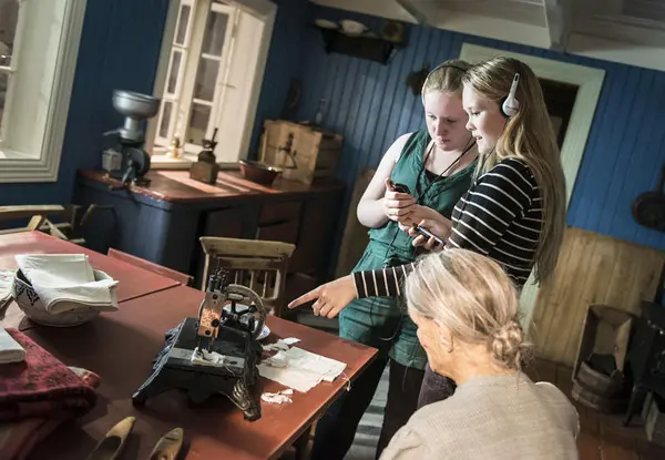 I utstillingen ser du naustet og stuahuset og det vesle saufjøset. Etter hvert ser du også flere av menneskene som bor her. Om du vil, kan du gå inn i naustet og hilse på far og sønn som steller med fyringen. Eller du vil kanskje heller besøke ho gammel-Karen Flatvika, som sitter inne på kjøkkenet. Hva er det hun steller med i dag? I døra til saufjøset står ei ung jente og drømmer seg bort. Hva drømmer hun om? Og ved naustveggen sitter det to karer, en gammel og en veldig ung. De snakker visst sammen. Her får de gamle, spennende fortellingene nytt liv hver eneste dag. "Du ha vel hørt om den gongen han Jens fekk ein pokal tå sølv frå sjølvaste kongen?", spør han gammel-Sivert.