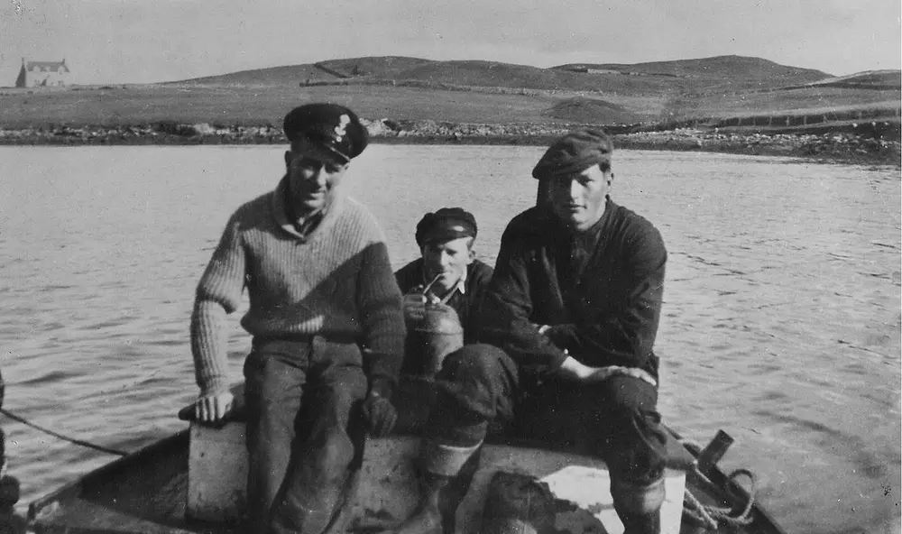 Fra venstre: Ingvald Johansen, Åge Sandvik og Johan Hermandsen. Blidet er tatt ved basen i Lunnavoe. Tilhører Scalloway Museum.