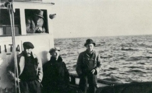 De fire marineoffiserene Tore Holthe, Per Danielsen, Øivind Schou og Christian Weydahl. Både Danielsen og Schou skulle bli høyt dekorerte for sin innsats under krigen. Med seg hadde de også fiskerne fra Fitjar: Alfred Engstrøm og Ola Tufteland.